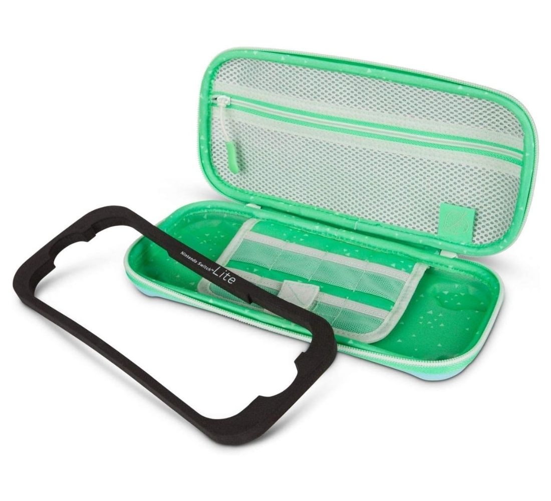 Tieni al sicuro Nintendo Switch (modello OLED), Nintendo Switch o Switch Lite con un robusto guscio esterno, manico gommato, un interno sagomato con fodera in feltro e una sezione portaoggetti in rete con cerniera.