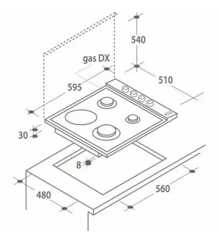 Dimensioni incasso: Larghezza: 49 cm, Profondità: 39 cm, Altezza: 1,5 cm.