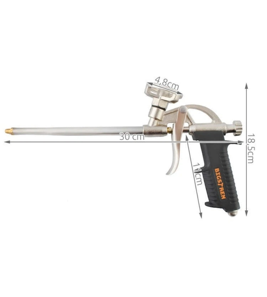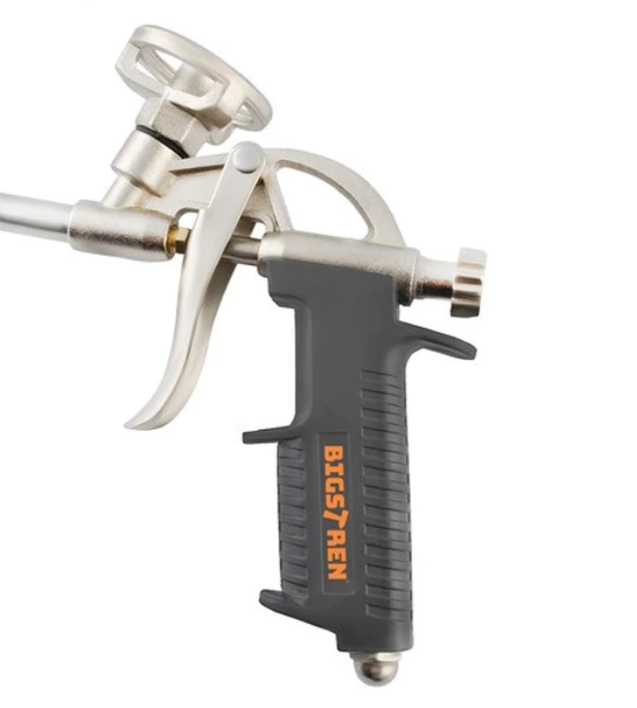 La pistola ha un corpo in metallo e comoda maniglia in plastica, è dotata di una manopola in metallo che consente di regolare il flusso di schiuma.